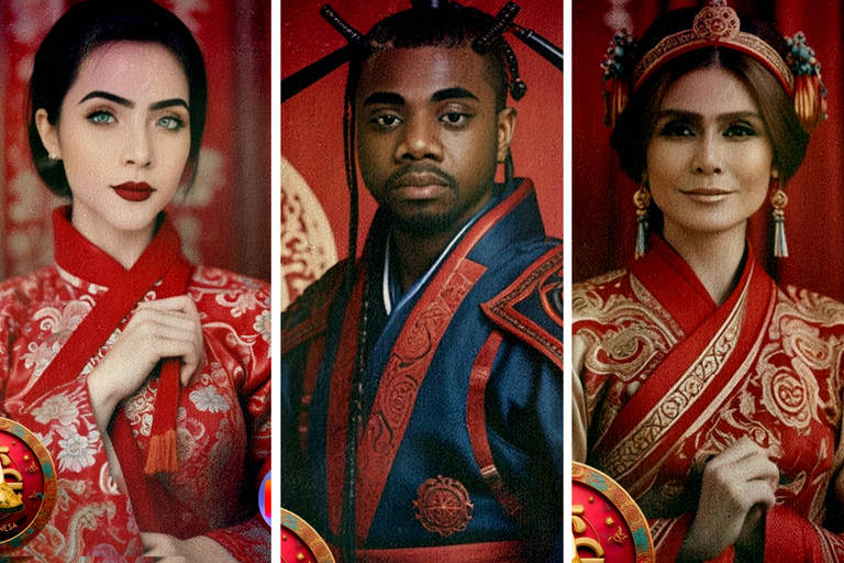 Jade Picon, Davi Brito e Giovanna Antonelle caracterizados em seus seus personagens criados artificialmente por IA // Fonte: UOL